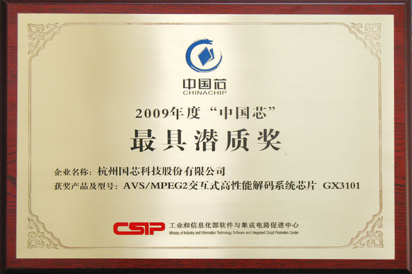 2009年12月17日,由工業(yè)和信息化部電子信息司指導、工業(yè)和信息化部軟件與集成電路促進中心(CSIP)主辦的2009中國集成電路產業(yè)促進大會暨第四屆“中國芯”頒獎典禮在無錫隆重召開,共有18家集成電路設計企業(yè)和終端應用廠商獲得了年度“中國芯”榮譽。杭州國芯科技股份有限公司(NationalChip)研發(fā)的AVS/MPEG2高性能解碼系統(tǒng)芯片GX3101獲得最具潛質獎,這是繼公司的衛(wèi)星數(shù)字電視解調解碼單片接收SoC芯片GX6101、有線數(shù)字電視信道接收芯片GX1001分別獲得第二屆、第三屆“中國芯”最佳市場表現(xiàn)獎之后,再次獲此殊榮。