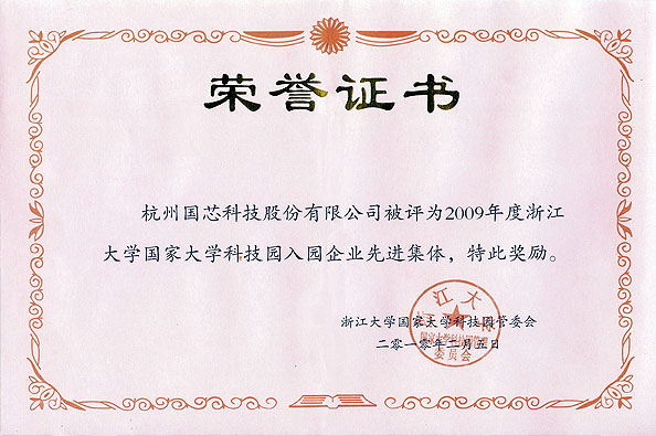 根據(jù)《浙江大學(xué)國家大學(xué)科技園入園企業(yè)先進(jìn)集體和先進(jìn)個人評選辦法》,經(jīng)公開報(bào)名和嚴(yán)格評選,有10家入園企業(yè)被授予“2009年度浙江大學(xué)國家科技園入園企業(yè)先進(jìn)集體”稱號,杭州國芯科技股份有限公司名列其中。杭州國芯總經(jīng)理柳荊生從眾多被評選人中脫穎而出,被授予“2009年度浙江大學(xué)國家科技園入園企業(yè)先進(jìn)個人”稱號。