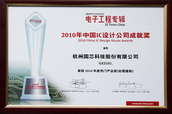 杭州國(guó)芯科技股份有限公司是繼2008年獲得“十大中國(guó)杰出服務(wù)型IC設(shè)計(jì)公司”、2009獲得“十大中國(guó)IC設(shè)計(jì)公司品牌”后,再次成功入選“十大中國(guó)IC設(shè)計(jì)公司品牌”,并且公司的AVS/MPEG2解碼系統(tǒng)芯片GX3101產(chǎn)品還榮獲2010年度熱門產(chǎn)品獎(jiǎng)(處理器類)。