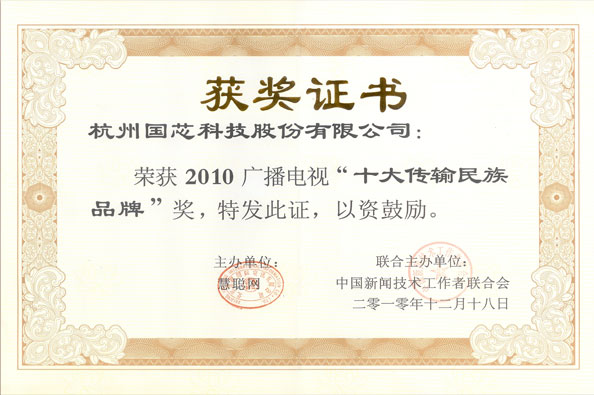 2010年12月18日,在北京釣魚臺國賓館舉行“創(chuàng)億杯·2010廣播電視十大優(yōu)秀企業(yè)評選”活動頒獎盛典。杭州國芯科技股份有限公司連續(xù)三年榮獲廣電十大民族品牌,公司董事長王匡榮獲十大杰出人物獎。