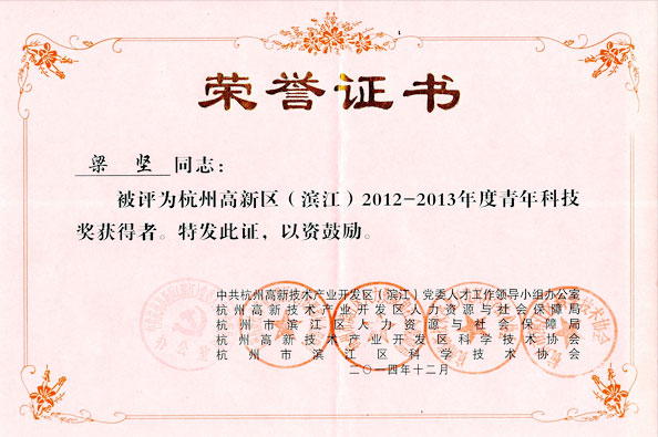 杭州國芯科技股份有限公司( NationalChip )梁堅(jiān)榮獲杭州市高新區(qū)“ 2012 — 2013 年度區(qū)青年科技獎(jiǎng)”。