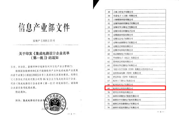 2005年2月1日,根據(jù)國務(wù)院頒布的《關(guān)于鼓勵軟件產(chǎn)業(yè)和集成電路產(chǎn)業(yè)發(fā)展的若干政策》(國發(fā)【2000】18號)及其相關(guān)政策的要求,中華人民共和國信息產(chǎn)業(yè)部認定了全國第一批集成電路設(shè)計企業(yè)。在認定名單中,杭州國芯科技股份有限公司榜上有名。