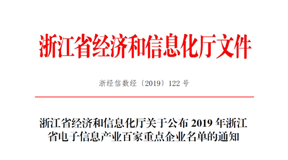 2019年7月12日,浙江省經(jīng)濟(jì)和信息化廳公布2019年浙江省電子信息產(chǎn)業(yè)百家重點(diǎn)企業(yè)名單,包含“2019年(第19屆)浙江省電子信息制造業(yè)業(yè)務(wù)收入前30家企業(yè)名單”、“2019年(第19屆)浙江省電子信息出口20家重點(diǎn)企業(yè)名單”、“2019年(第19屆)浙江省軟件業(yè)務(wù)收入前30家企業(yè)名單”和“2019年(第19屆)浙江省電子信息50家成長(zhǎng)性特色企業(yè)名單”。