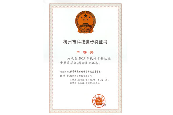 2006年11月10日,根據(jù)《杭州市科技進步獎勵辦法》的有關(guān)規(guī)定,經(jīng)市科技進步獎評審委員會審核,市政府授予杭州國芯科技股份有限公司的衛(wèi)星/有線數(shù)字電視信道接收集成電路成果“2006年杭州市科技進步一等獎”榮譽。