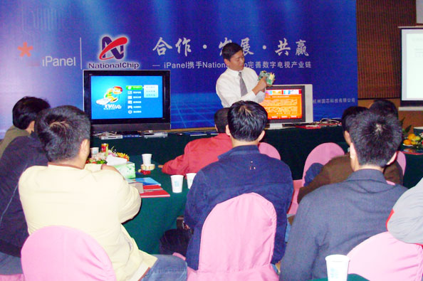 藉此機會,iPanel攜手NationalChip在杭州文華大酒店舉行了題為“合作 發(fā)展 共贏――攜手完善數(shù)字電視產(chǎn)業(yè)鏈”為期三天的專場展示會,對NationalChip芯片平臺下iPanel數(shù)據(jù)廣播進行了現(xiàn)場演示。多家運營商及國內的主流機頂盒廠商均出席到場參觀、洽談。