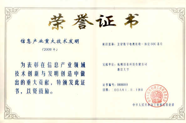 杭州國芯(NationalChip)衛(wèi)星數(shù)字電視SOC芯片榮獲2008年度信息產(chǎn)業(yè)重大技術(shù)發(fā)明獎,這是繼2005年公司的數(shù)字電視解調(diào)芯片獲得這一獎項(xiàng)后,再次獲得這一殊榮,杭州國芯(NationalChip)相關(guān)負(fù)責(zé)人表示,公司開發(fā)的數(shù)字電視芯片產(chǎn)品銷售已超過四千萬片,業(yè)已成為國內(nèi)數(shù)字電視領(lǐng)域芯片產(chǎn)品品種超齊全、出貨量極其龐大的本土芯片設(shè)計(jì)企業(yè)。有線數(shù)字電視解調(diào)芯片、衛(wèi)星解調(diào)芯片和衛(wèi)星解調(diào)解碼SOC芯片三款產(chǎn)品都占據(jù)國內(nèi)率先的本土芯片市場份額。